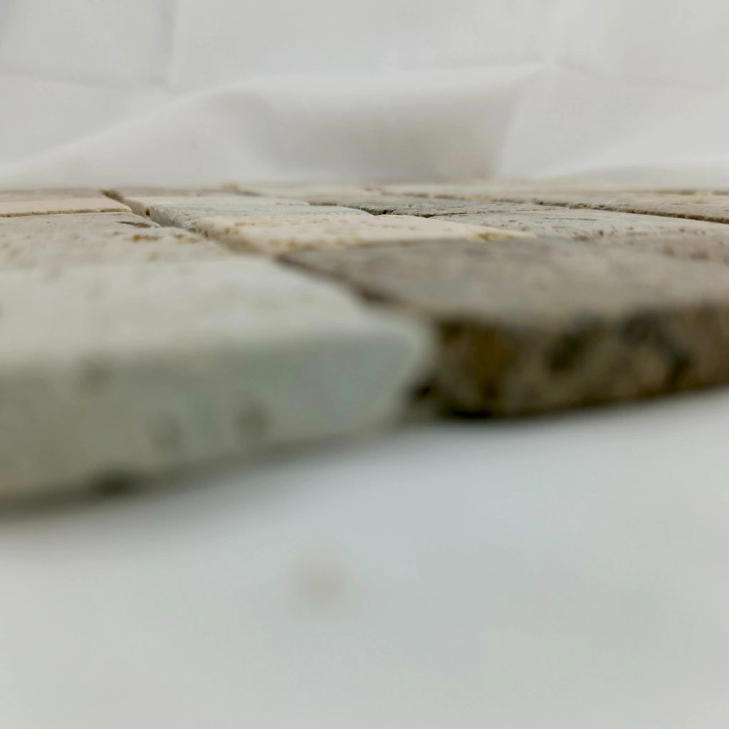 Travertino es la denominación de una roca sedimentaria de origen parcialmente biogénico, formada por depósitos de carbono de calcio y que se utiliza con frecuencia como piedra ornamental. En mosaiquismo se usa como tesela.